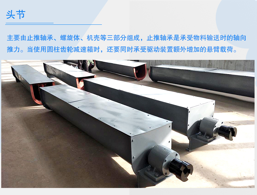 頭節:主要由止推軸承、螺旋體、機殼(ké)等三部分組成,止推軸承是承受物料輸送時的軸向推力。當使用圓柱齒輪減速箱時,還要同時承受驅(qū)動(dòng)裝置額外增(zēng)加的懸臂載荷。