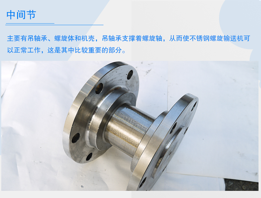 中間節:主要有吊軸承、螺旋體(tǐ)和機殼,吊軸承支撐著螺旋軸,從而使不鏽(xiù)鋼螺旋輸(shū)送機(jī)可以正常工作,這是其中比較重要的部分。