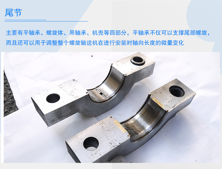 尾(wěi)節:主(zhǔ)要有(yǒu)平軸承、螺旋體、吊軸承、機殼等四部分,平軸承(chéng)不僅可以支撐尾部螺旋,而且還可以用於(yú)調整整個螺旋輸送機在進行安裝(zhuāng)時軸向長度的微量變化。