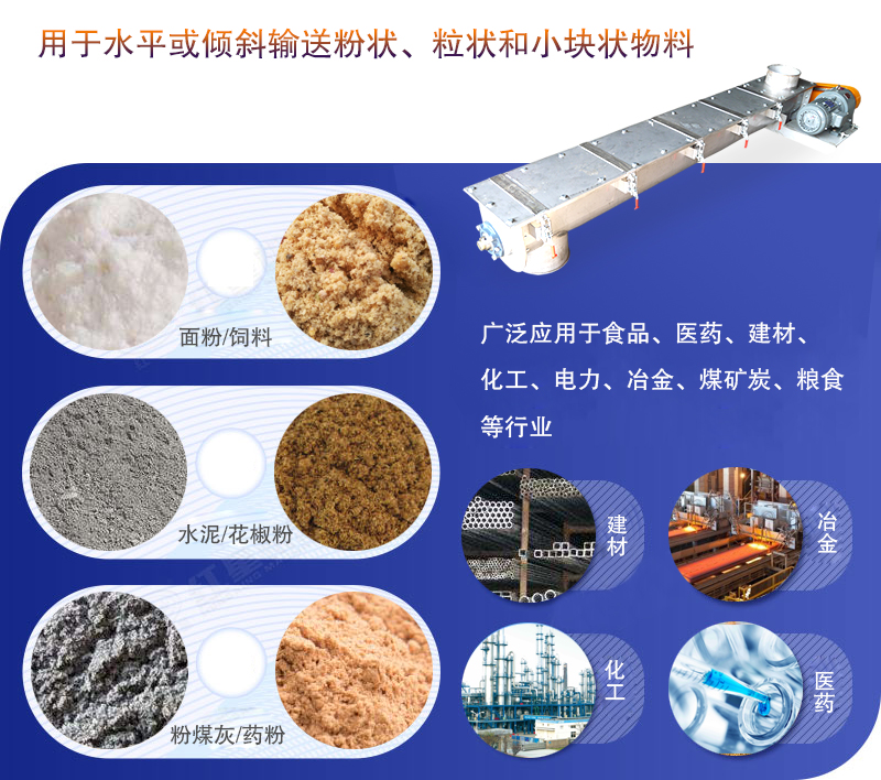 不鏽(xiù)鋼螺旋輸送機廣泛應用於食(shí)品、醫藥、建材、化工、電力、冶金、煤礦炭(tàn)、糧食等行業(yè),適用於(yú)水(shuǐ)平或傾斜輸送粉狀、粒狀和小塊狀物料,尤其適合食品、醫藥行業,可以滿足行業衛(wèi)生標準,可輸(shū)送諸(zhū)如麵(miàn)粉(fěn)、飼料、花椒粉、藥粉等對衛生要求嚴(yán)格的物料。