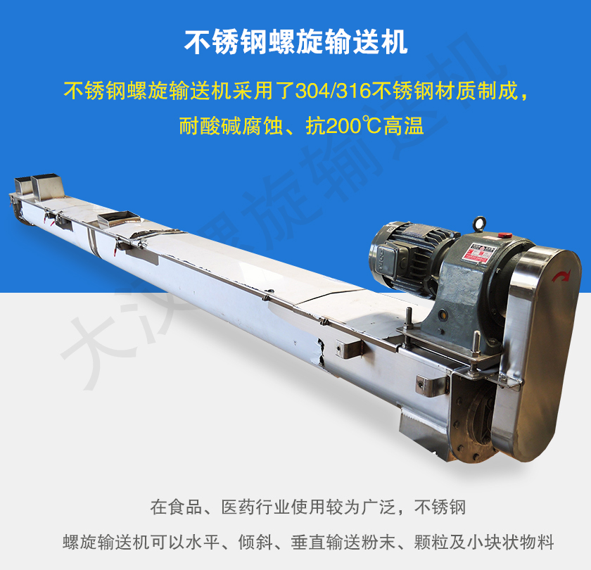 不鏽鋼螺旋輸送機采用了304/316不鏽鋼材質製成,耐酸(suān)堿腐蝕、抗(kàng)200℃高溫、防止機器生鏽而汙染到物料,所以在食品、醫藥行業使用較為廣泛,不鏽鋼螺旋(xuán)輸送機可以水(shuǐ)平(píng)、傾斜(xié)、垂直輸送粉末、顆粒及小塊狀物料。