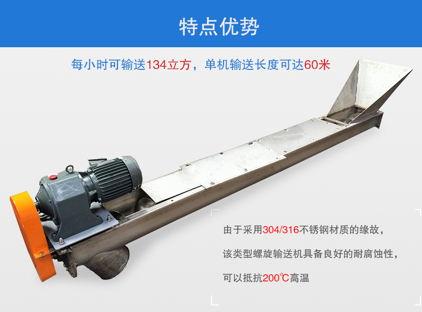 3、由於采用304/316不鏽鋼材質的緣故,該類型螺旋輸送機具備(bèi)良好的耐腐蝕性,可以抵(dǐ)抗200℃高溫;
